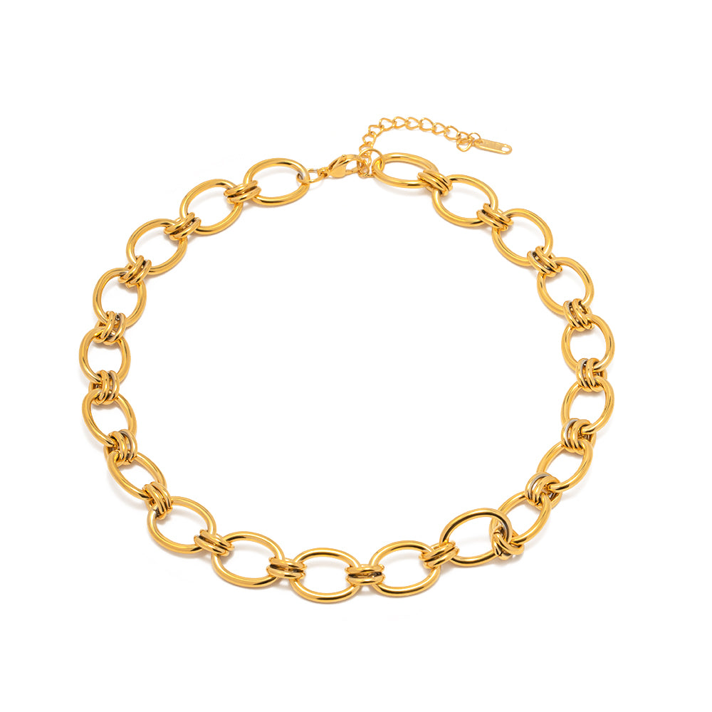 El Collar Conexión Real combina eslabones dorados de diseño elegante y firme, creando una joya que simboliza la fuerza de los lazos verdaderos y la distinción de quien lidera con estilo.