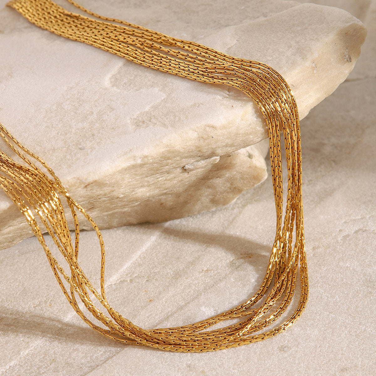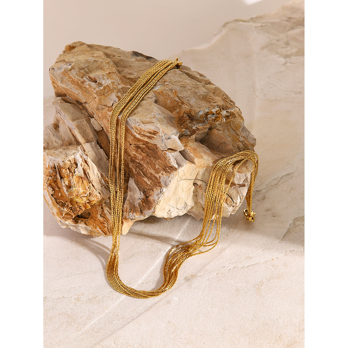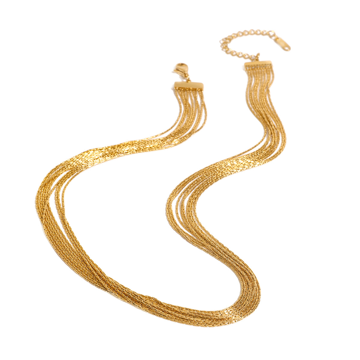 El Collar Impérial irradia elegancia y poder con sus delicadas cadenas doradas que caen con armonía, reflejando la majestuosidad del oro en cada movimiento.