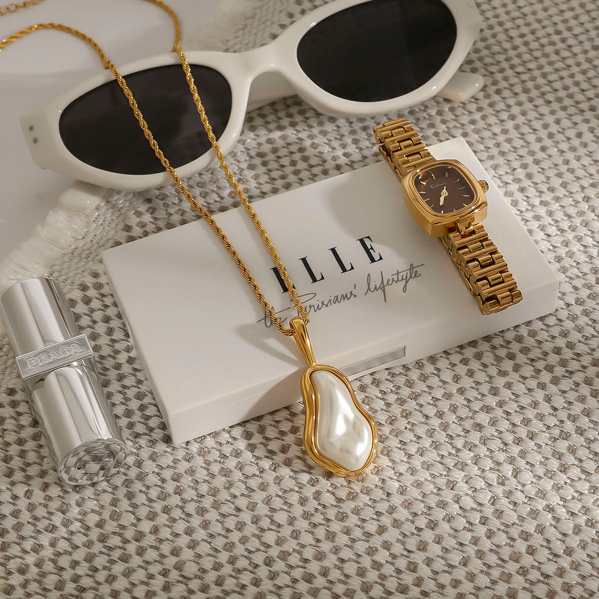El Collar Gota de Luna combina el brillo dorado con la elegancia natural del nácar, creando una pieza que refleja serenidad, pureza y sofisticación atemporal.