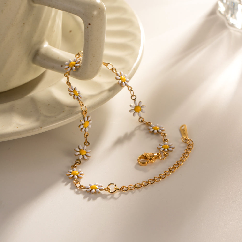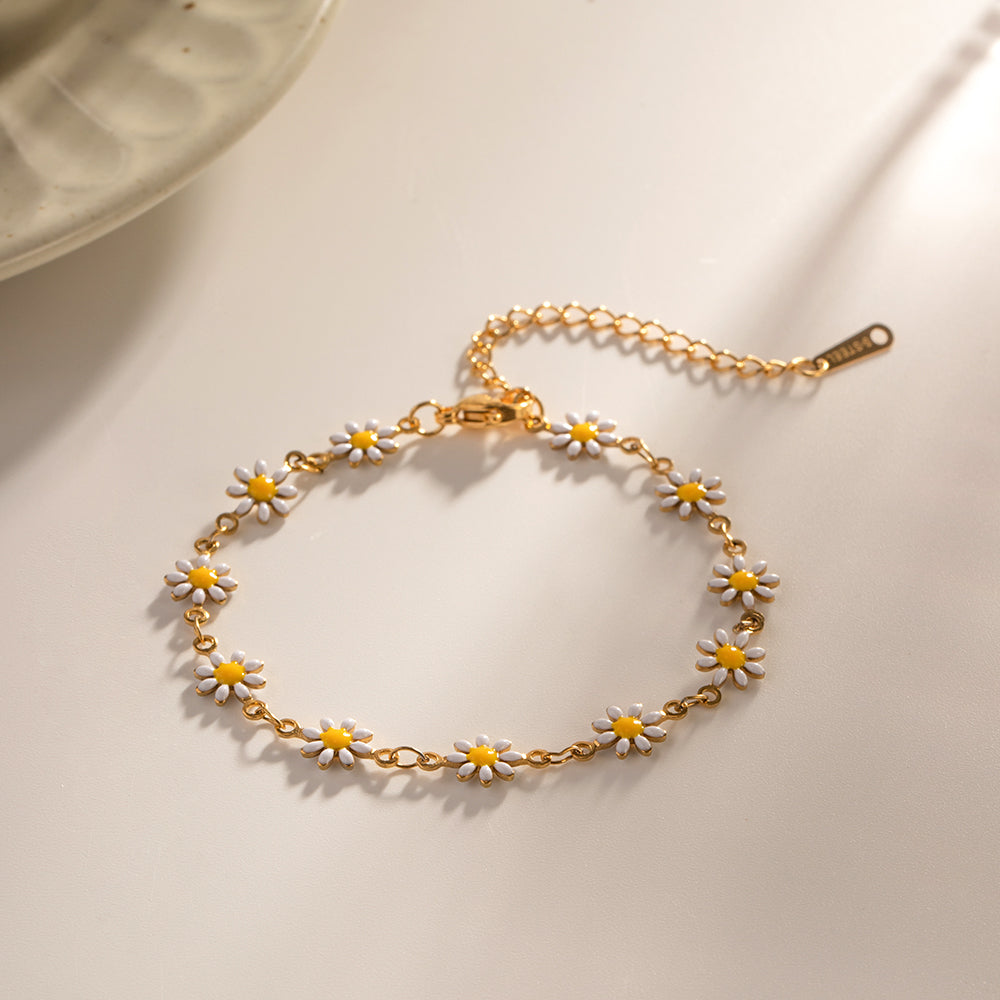 La Pulsera Dolce Primavera celebra la belleza de los días soleados y el encanto natural de las flores. Su diseño en tonos dorados y margaritas esmaltadas refleja frescura, alegría y elegancia atemporal.